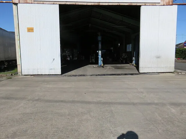 整然と並ぶオイル缶、そして奥には小さな事務スペースも見えます。