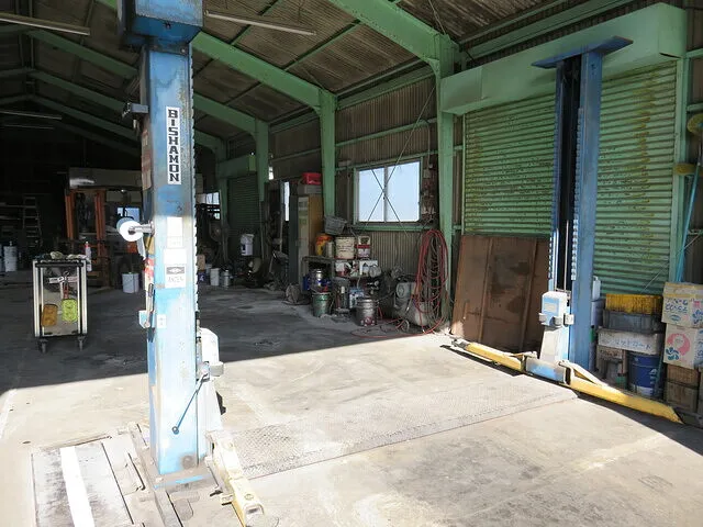 朝の光が差し込む整備工場の中、静かにたたずむリフトや工具たち。